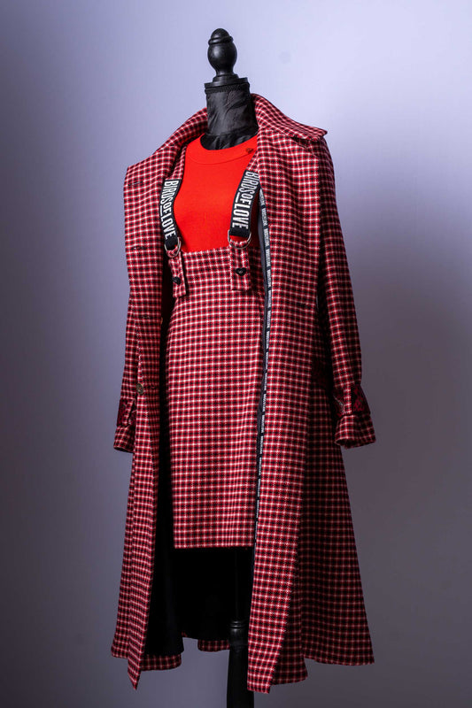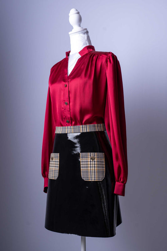 Damen-Outfit Bluse & Rock | Rote Satinbluse | Lackrock mit Karodetails