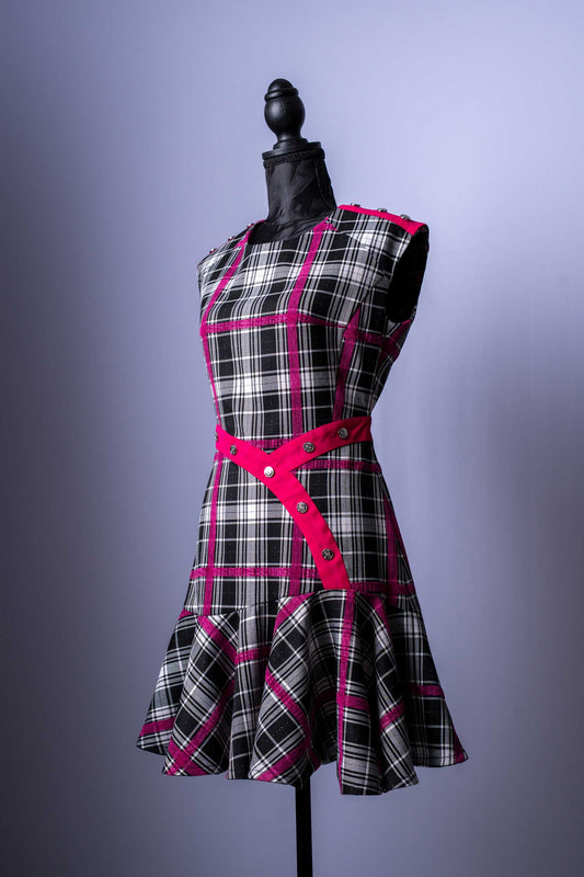 Damen-Outfit 2-Teiler | Karomuster-Kleid & Jacke | Pinke Akzente