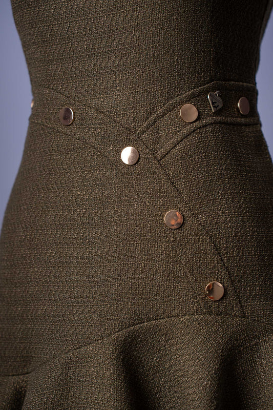 Damen-Mini-Kleid | Olivgrün Tweed-Look | Asymmetrischer Saum & Goldene Knöpfe