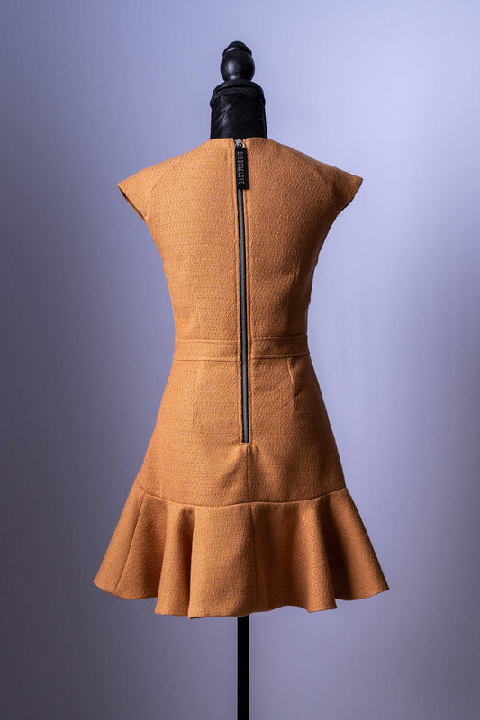 Damen-Mini-Kleid | Camel-Farbton | Asymmetrischer Saum & Goldene Knöpfe