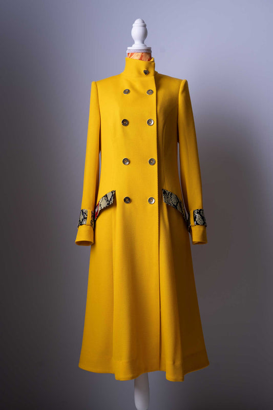 Eleganter Damen-Mantel Gelb | Doppelreiher | Einzigartige Schlangenprint-Details
