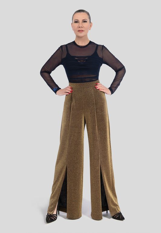 Goldene Hose mit weitem Bein – Elegante Stoffhose für Damen