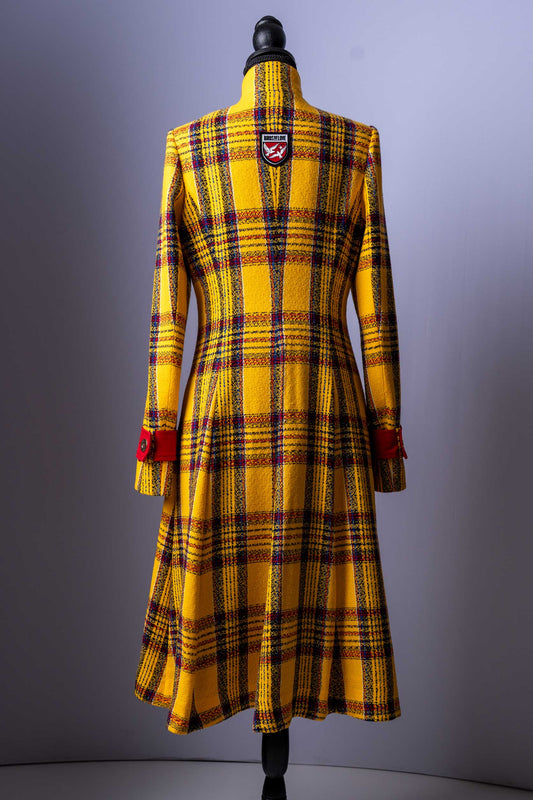 Langer Damen-Mantel | Gelb-rotes Karomuster | Doppelreiher | A-Linie