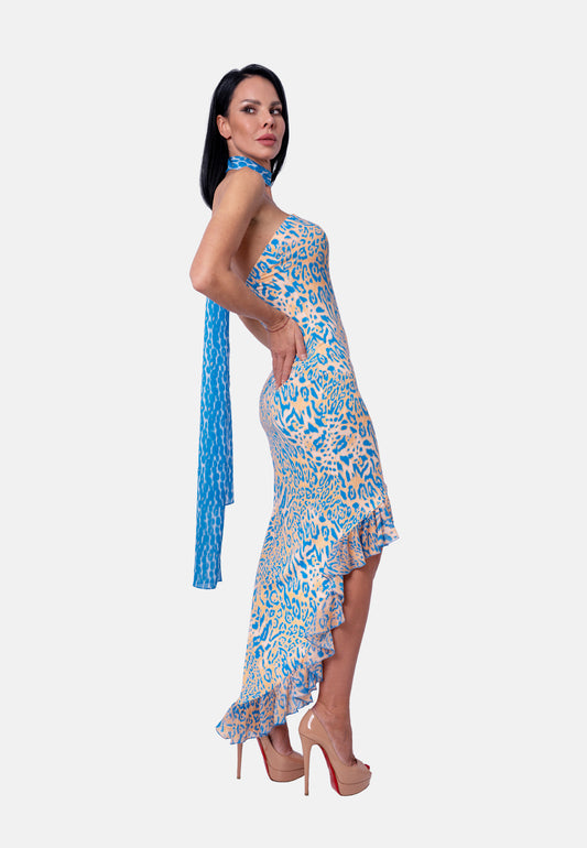Kurzes Kleid mit V-Ausschnitt und Volantrock im Animalprint in Flieder-Beige | Birds of Wild Grace by Birds of Love