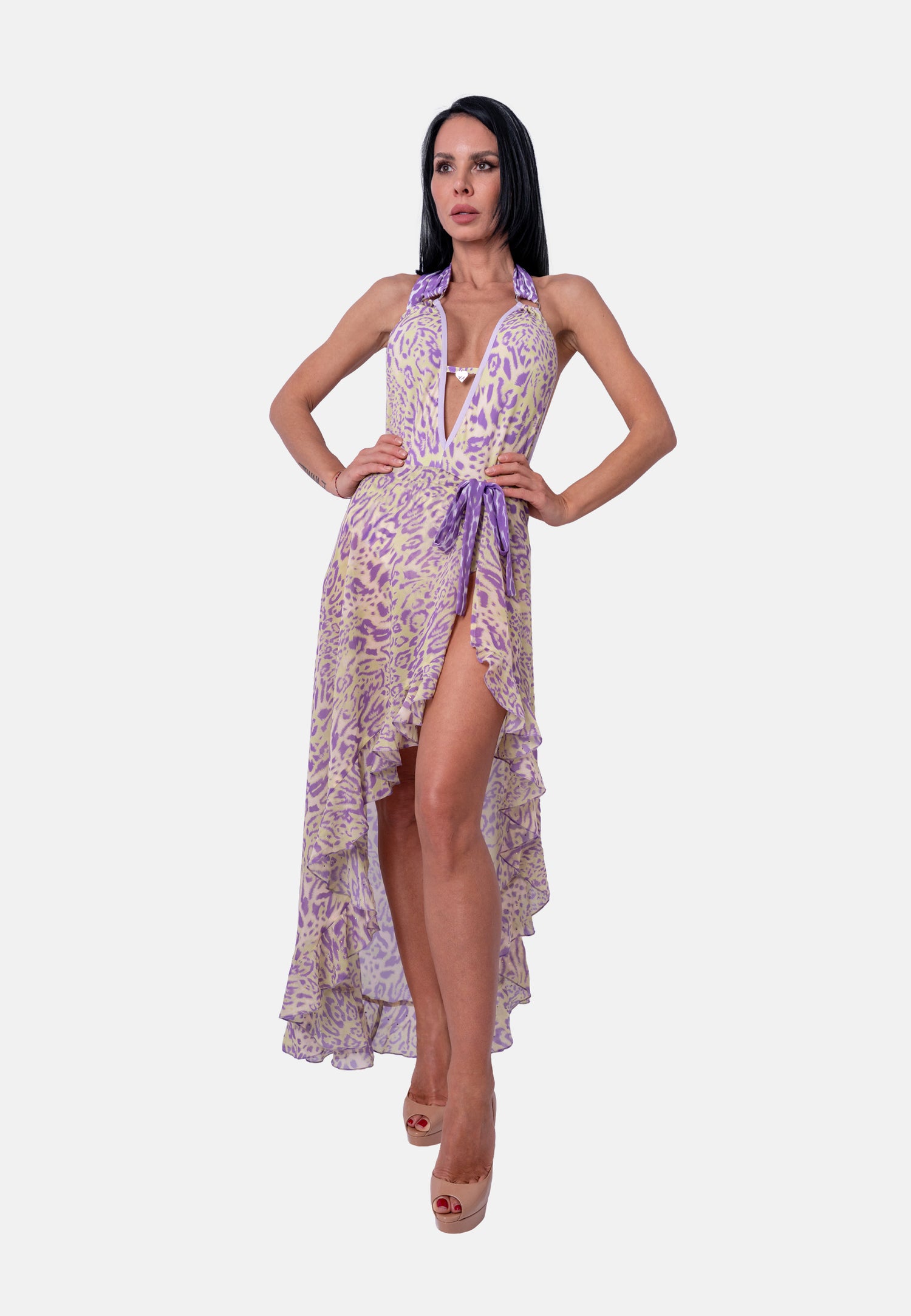 Dieses ausdrucksstarke Badeanzug-Body in Flieder-Beige mit modernem Animalprint vereint sinnliche Eleganz mit moderner Vielseitigkeit. Der tiefe V-Ausschnitt setzt das Dekolleté feminin in Szene, während der Halterneck-Schnitt Schultern und Rücken stilvoll betont und dem Design eine selbstbewusste, luxuriöse Ausstrahlung verleiht.