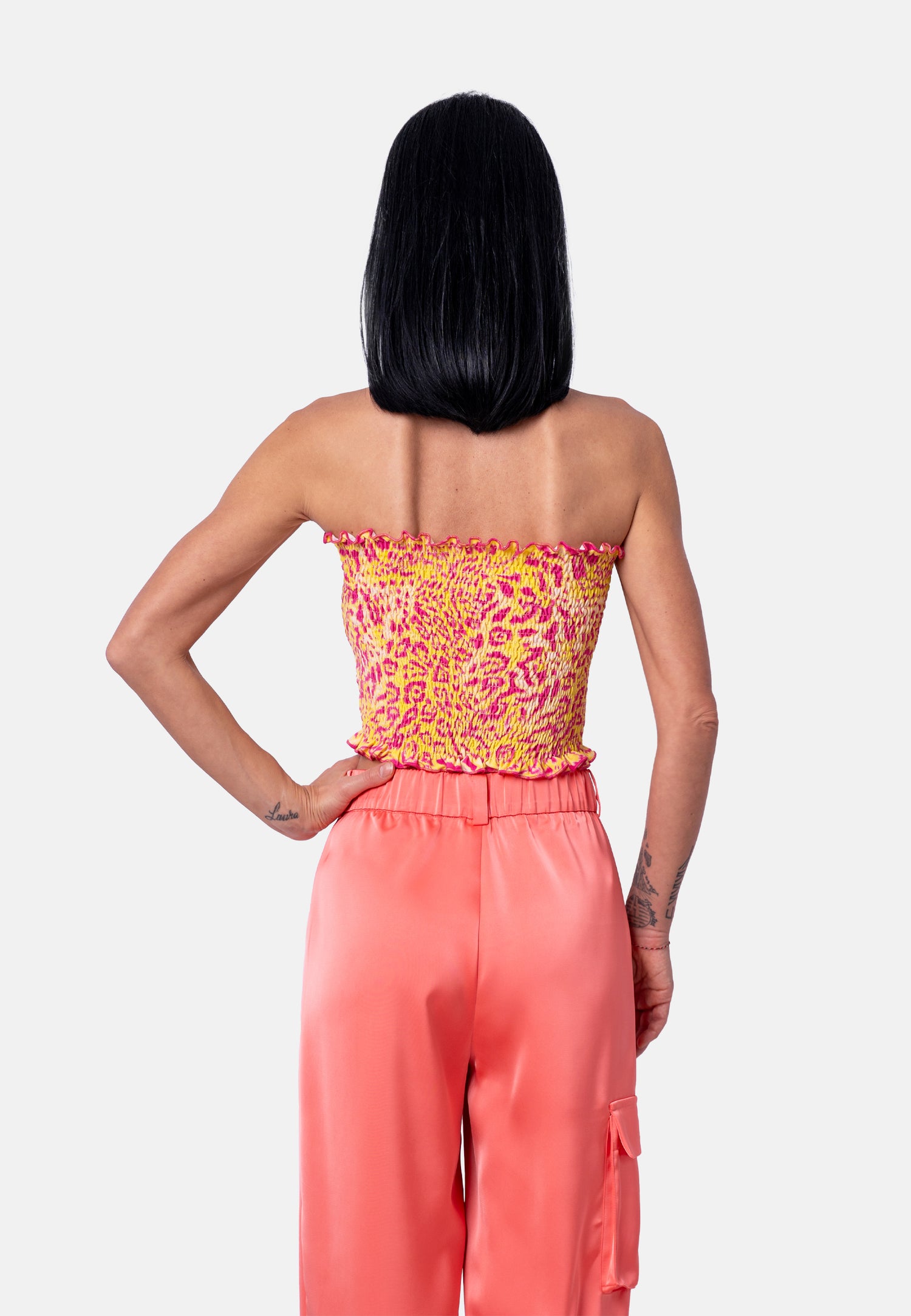 Dieses moderne trägerlose Crop-Top in leuchtendem Gelb-Pink mit ausdrucksstarkem Animalprint vereint sommerliche Leichtigkeit mit femininer Eleganz. Die elastisch geraffte Struktur passt sich sanft der Silhouette an und setzt Schultern sowie Dekolleté stilvoll in Szene, während der fein gewellte Abschluss dem Design eine verspielte und zugleich raffinierte Note verleiht.