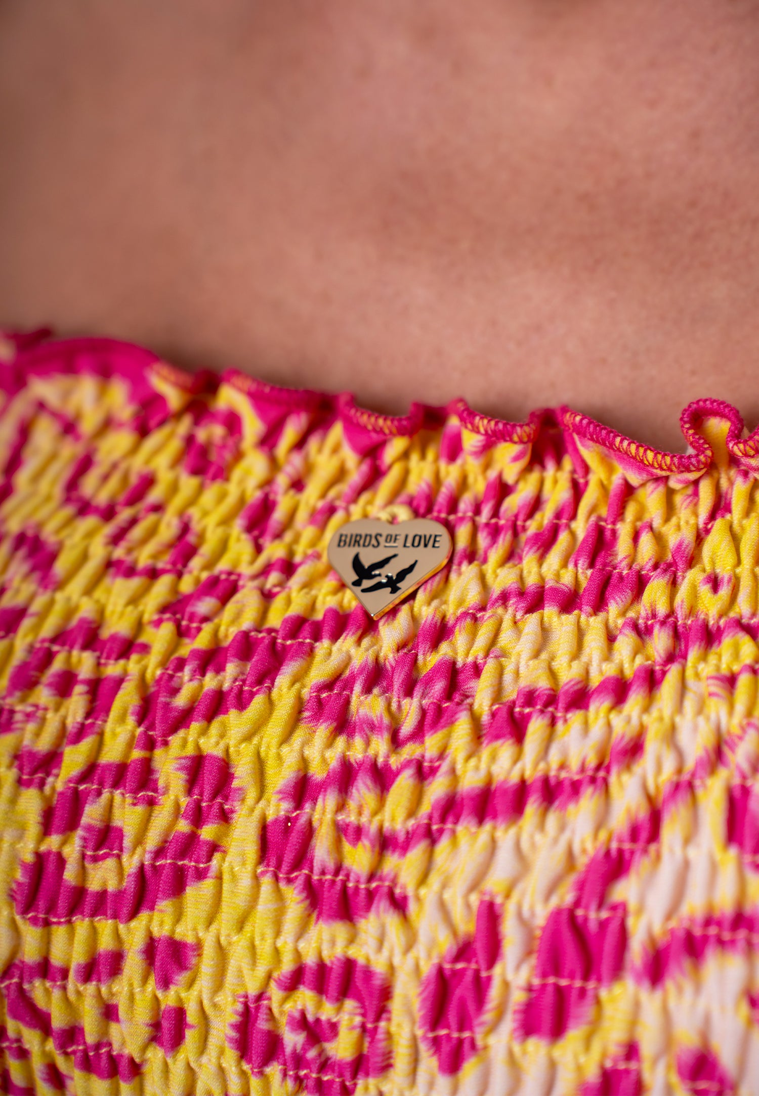 Trägerloses Crop-Top mit geraffter Struktur im Animalprint in Gelb-Pink | Birds of Wild Grace by Birds of Love