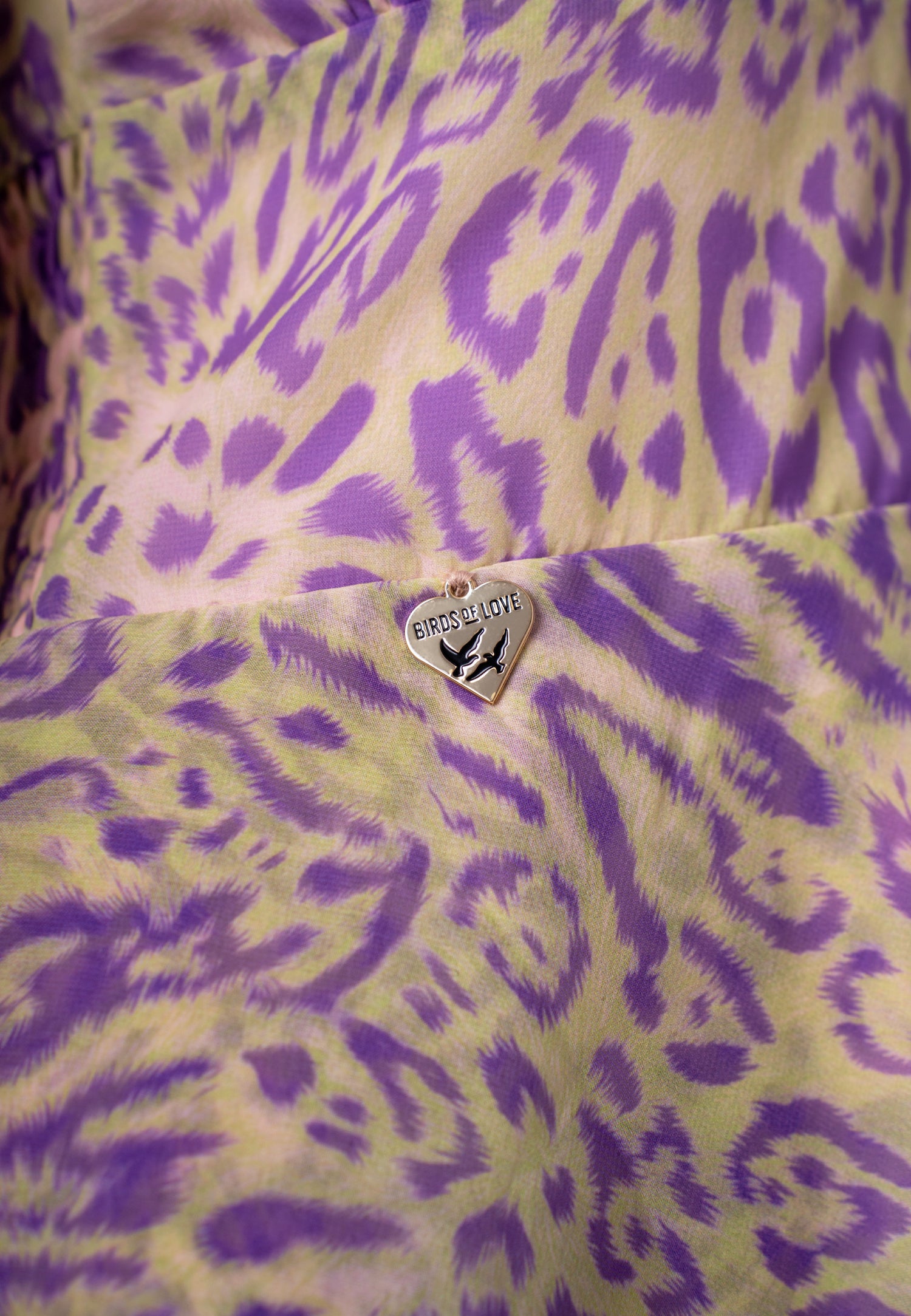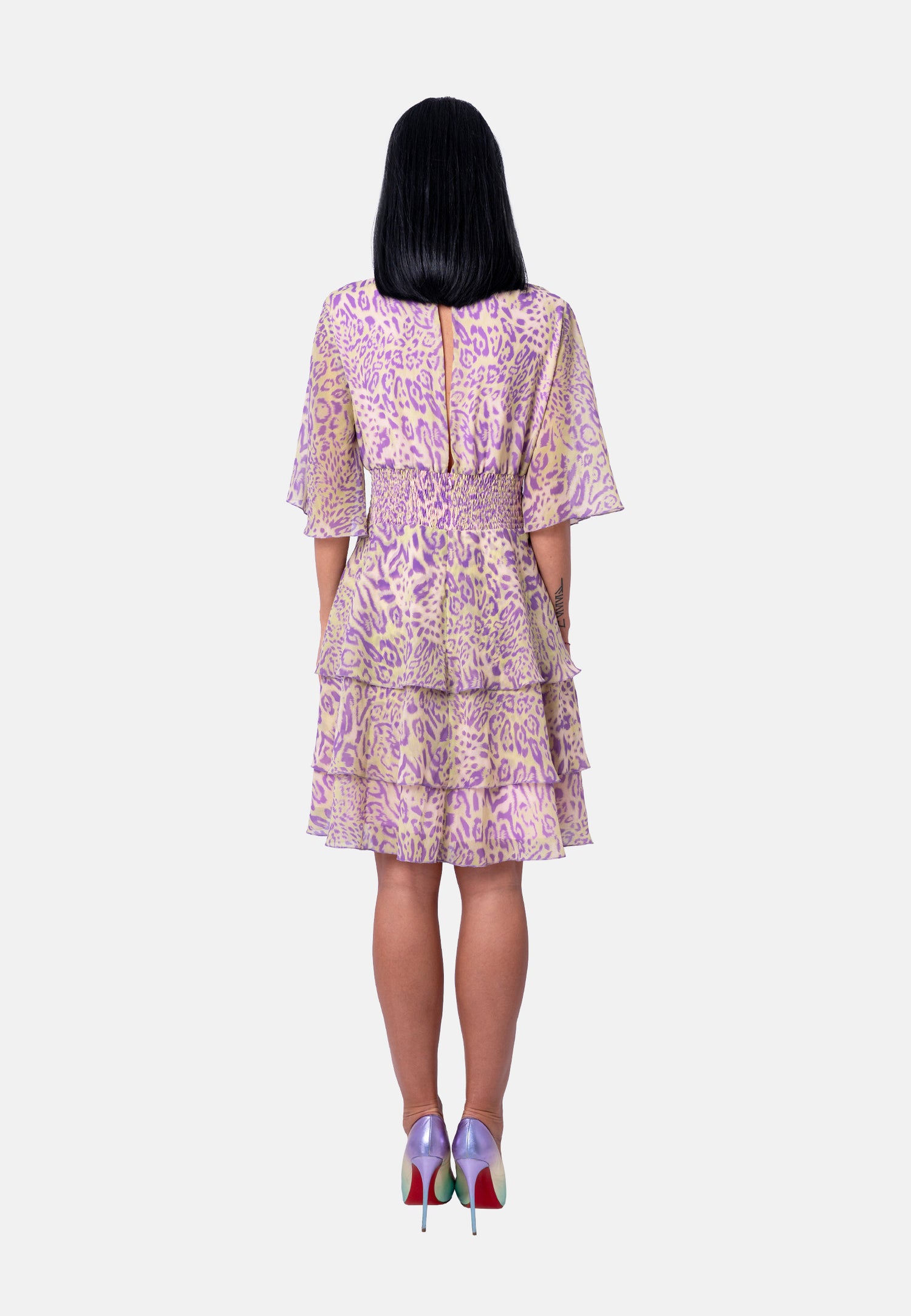 Kurzes Kleid mit V-Ausschnitt und Volantrock im Animalprint in Flieder-Beige | Birds of Wild Grace by Birds of Love