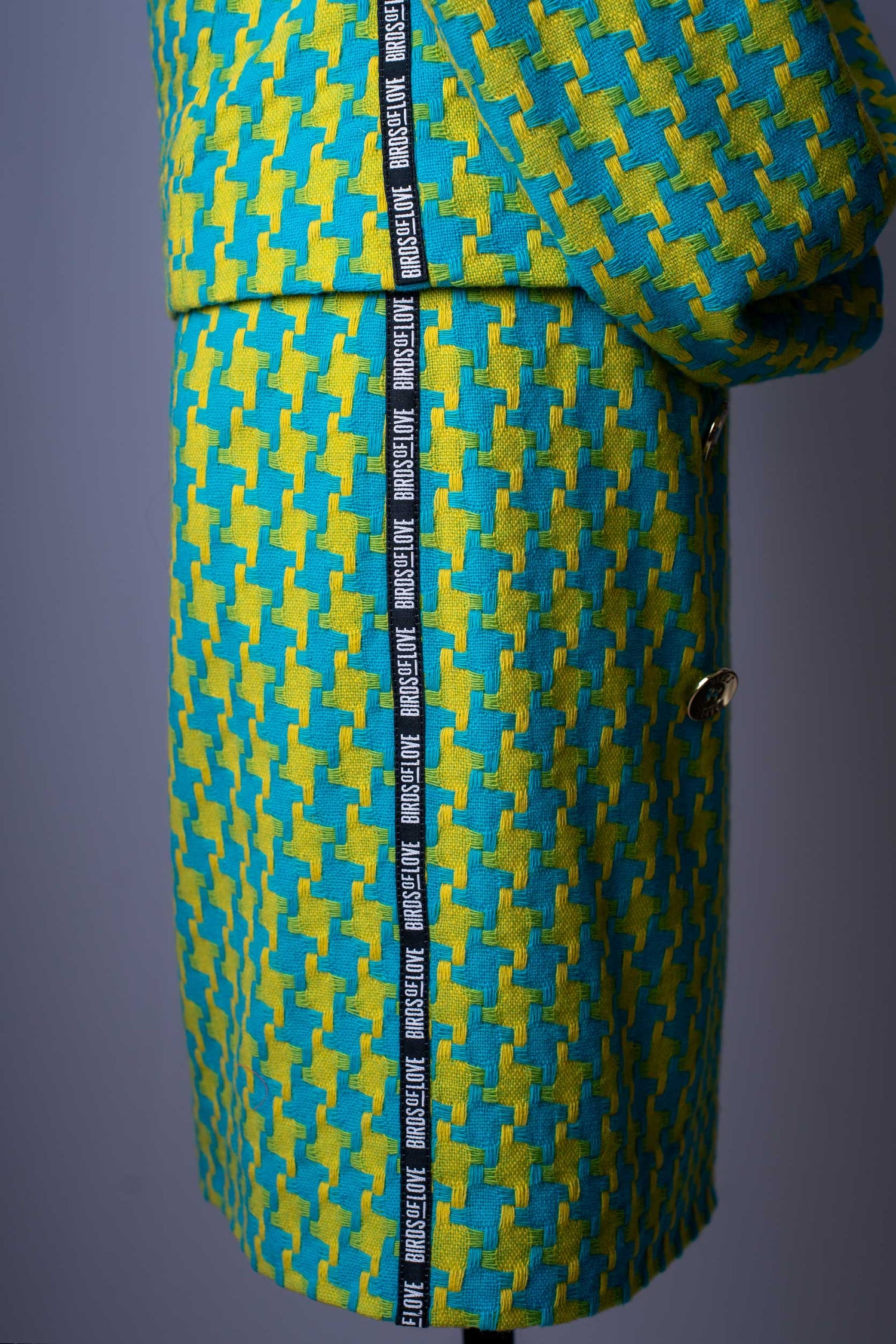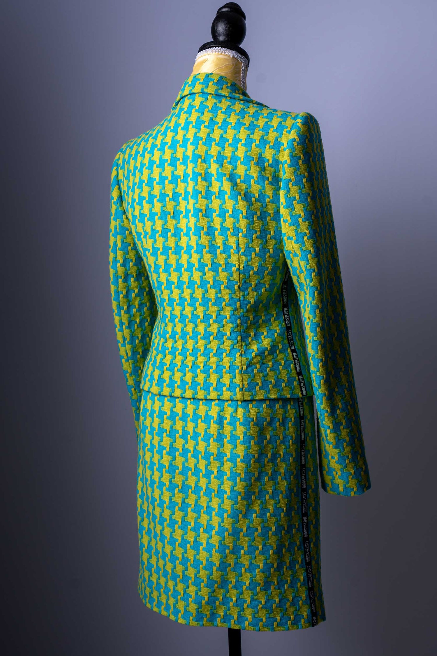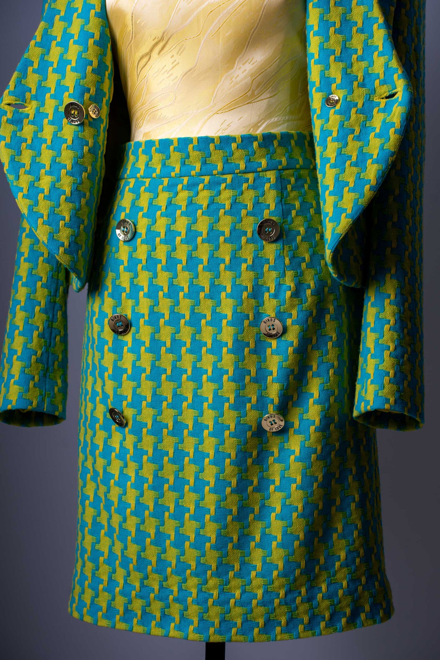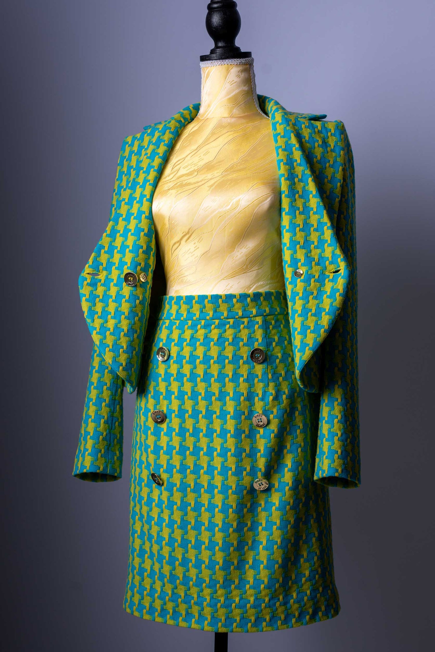 Das Set besteht aus einem asymmetrisch geschnittenen Doppelreiher-Blazer und einem passenden Minirock . Das einzigartige, Hahnentritt Muster in leuchtendem Türkis und Gelb zieht alle Blicke auf sich. Die auffälligen goldfarbenen Knöpfe setzen einen luxuriösen Akzent und runden den Look perfekt ab. Der taillierte Schnitt des Blazers und die schlichte A-Linie des Rocks sorgen für eine schmeichelhafte Silhouette.