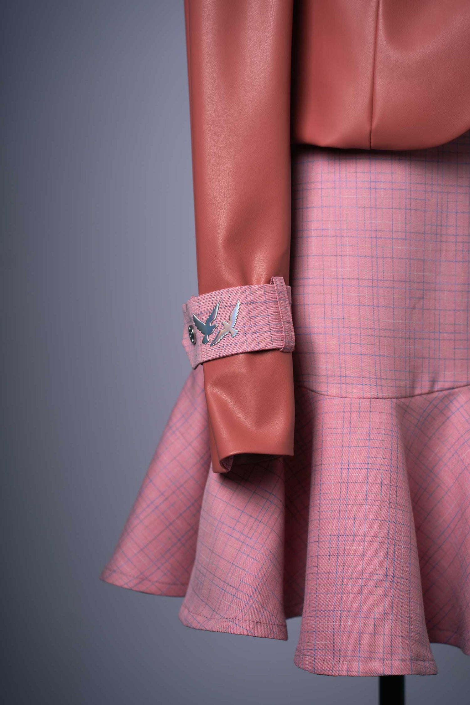 Material: Kleid – weicher Stoff mit Details aus veganem Leder; Jacke – hochwertiges Kunstleder