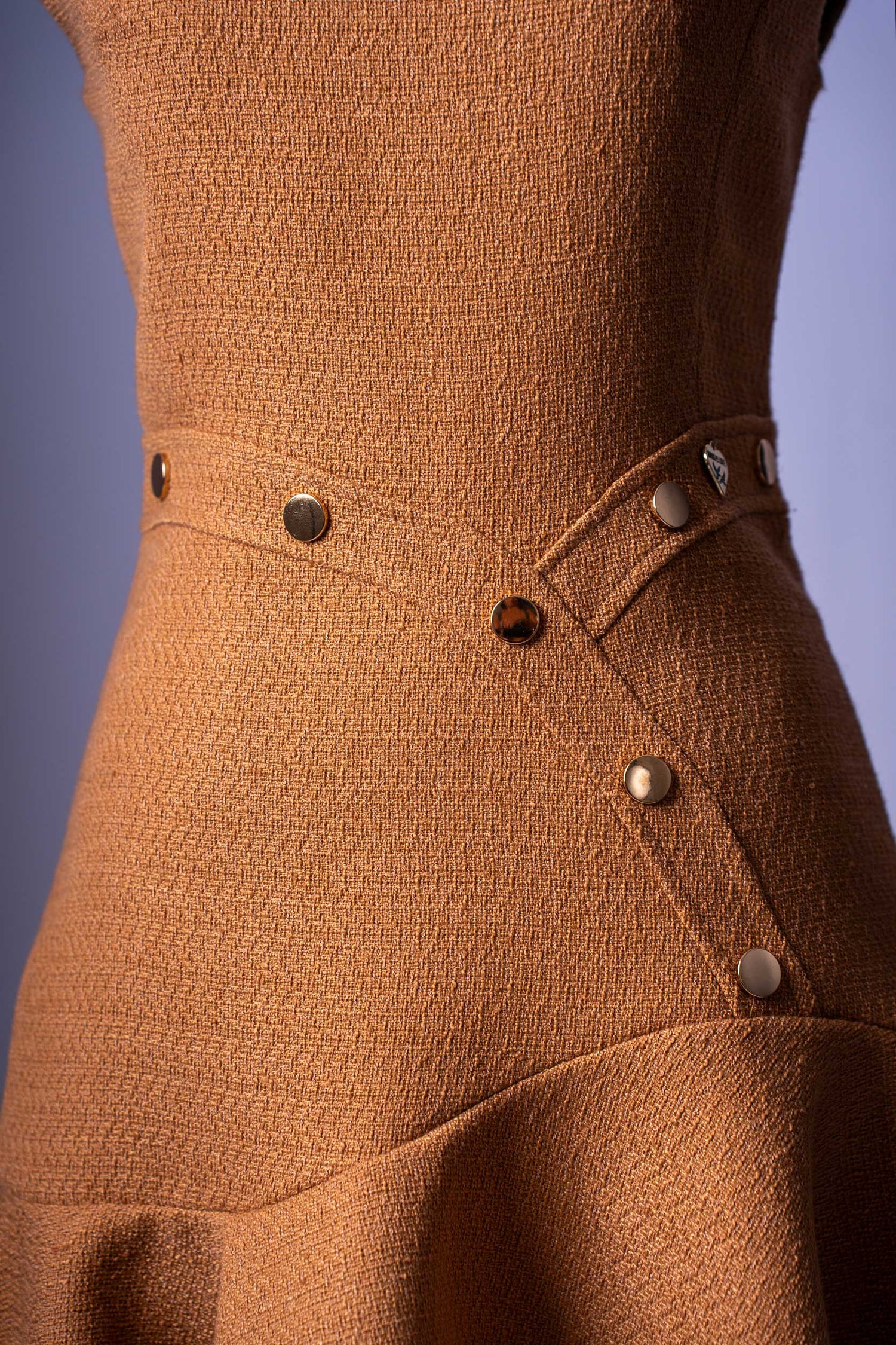 Damen-Mini-Kleid | Camel-Farbton | Asymmetrischer Saum & Goldene Knöpfe