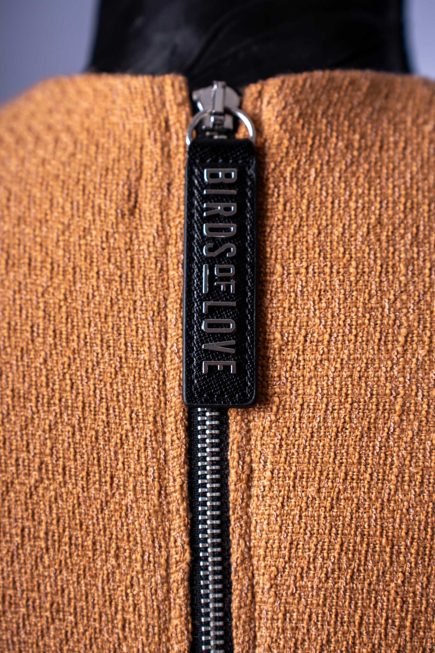 Setzen Sie ein modisches Statement mit diesem einzigartigen Mini-Kleid in einem eleganten Camel-Ton. Dieses Kleidungsstück ist die perfekte Mischung aus klassischer Textur und modernem, verspieltem Design.