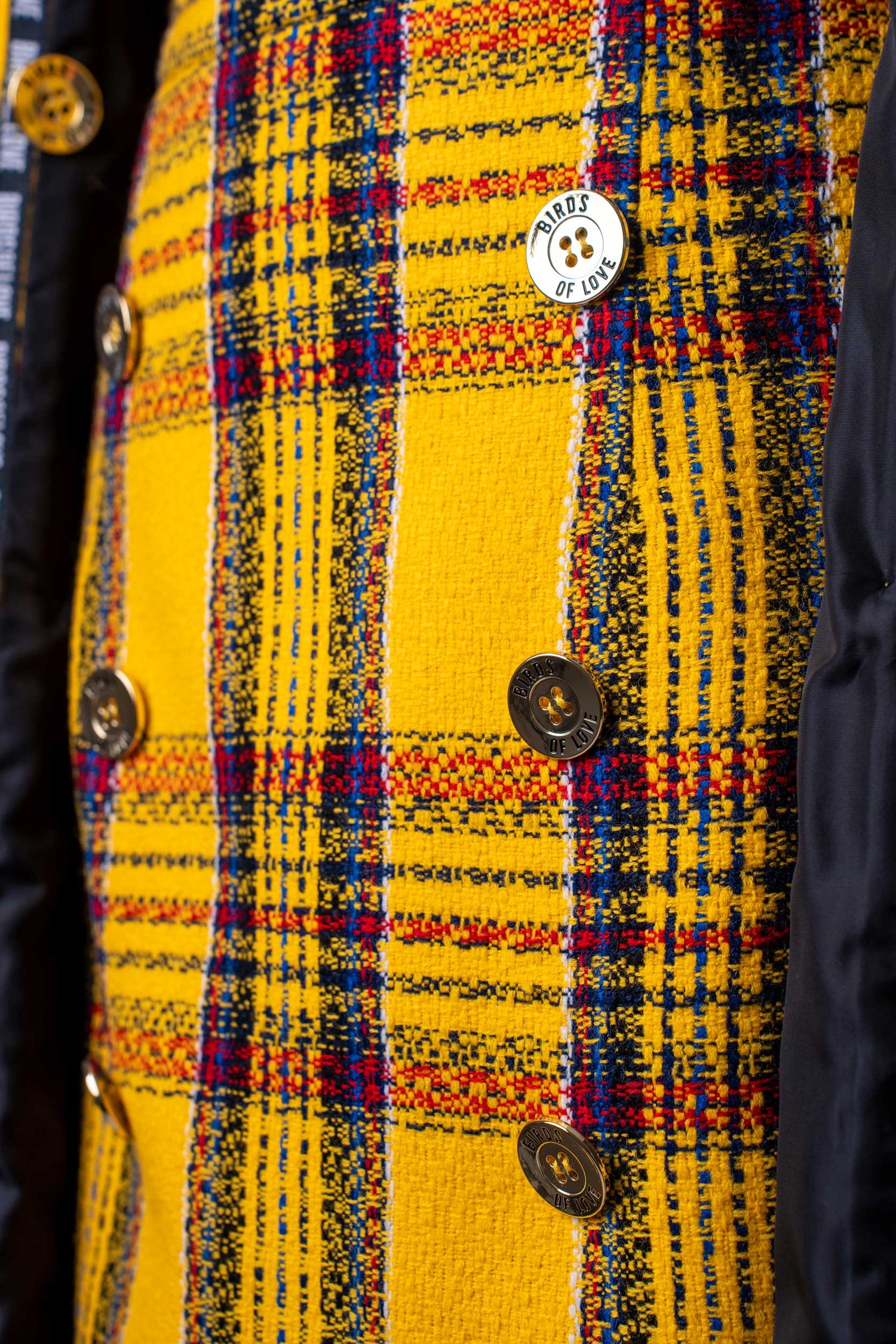 Gefertigt aus einem hochwertigen Stoff mit sichtbarer Textur, besticht der Rock durch sein auffälliges Karomuster in leuchtendem Gelb, Rot und Blau. Der Doppelreiher-Schnitt mit großen Knöpfen verleiht ihm einen stilvollen Akzent. Seine hohe Taille und die klassische A-Linien-Form sorgen für eine schmeichelhafte Silhouette. Dieser Rock ist das perfekte Statement-Piece, das jedem Outfit eine modische Note verleiht.