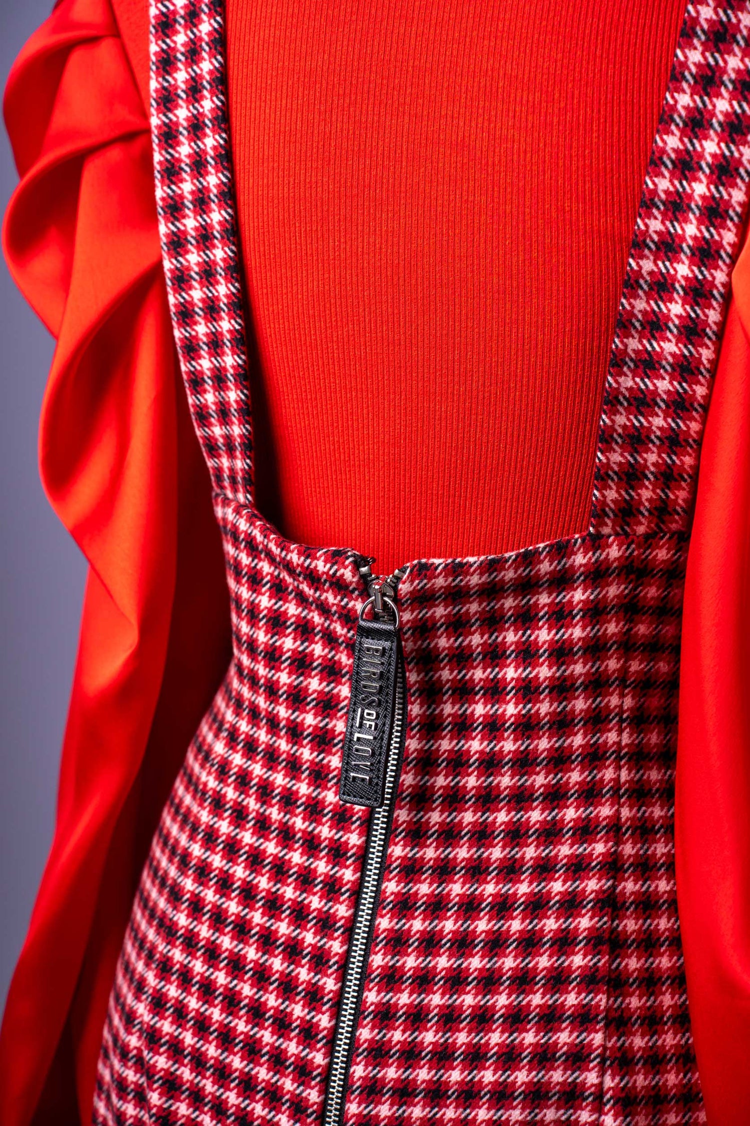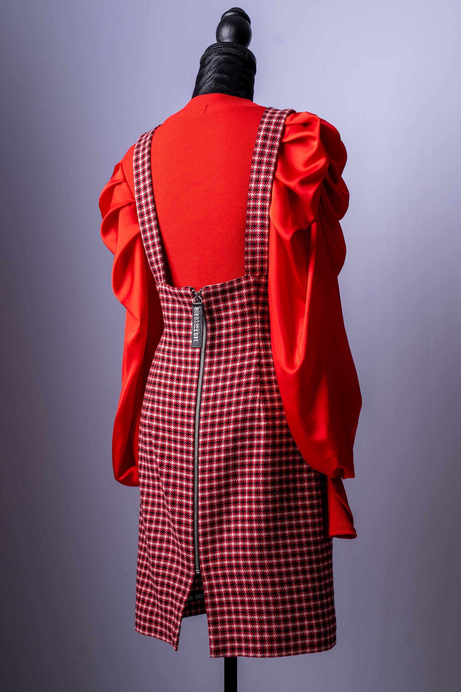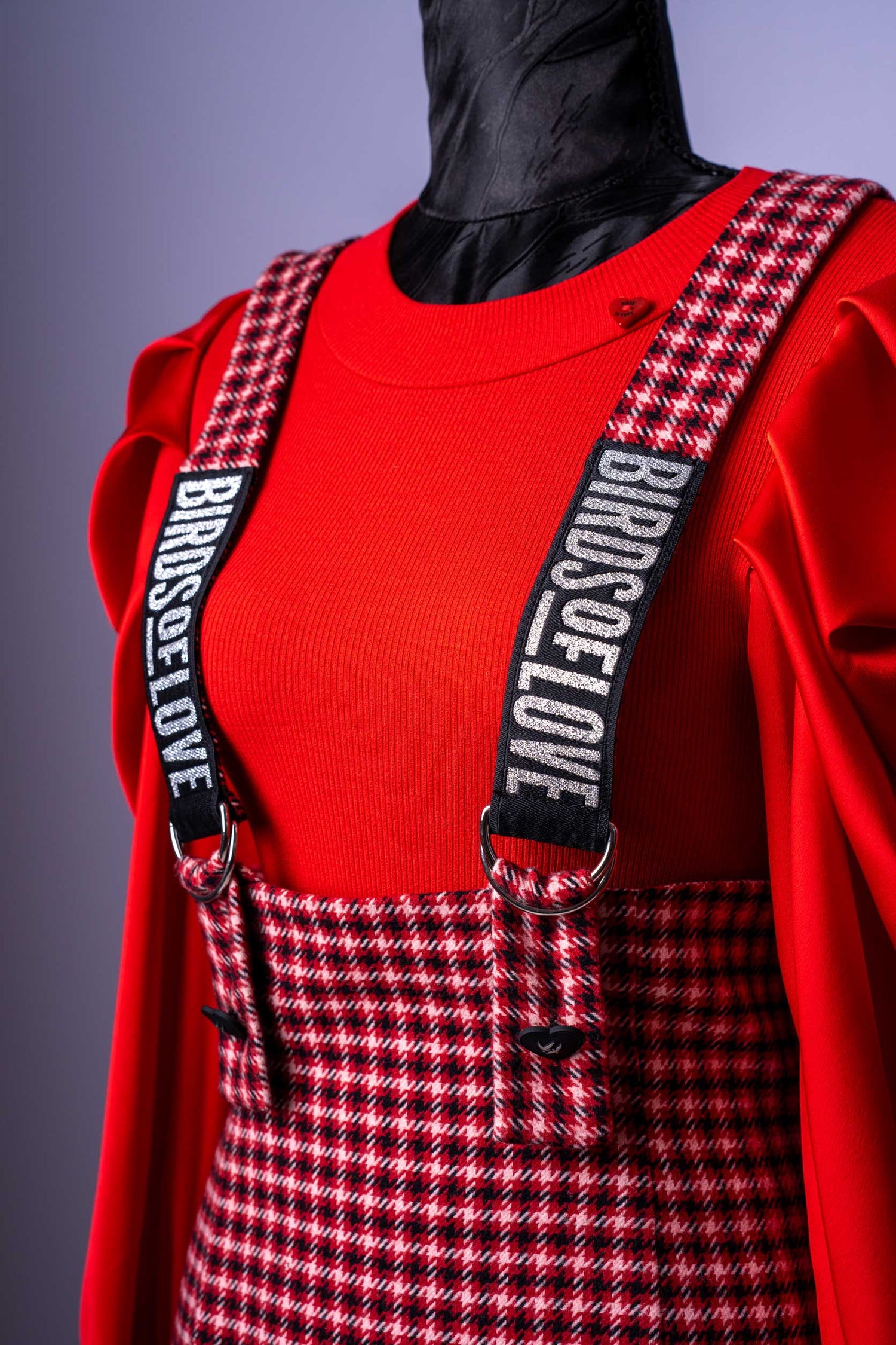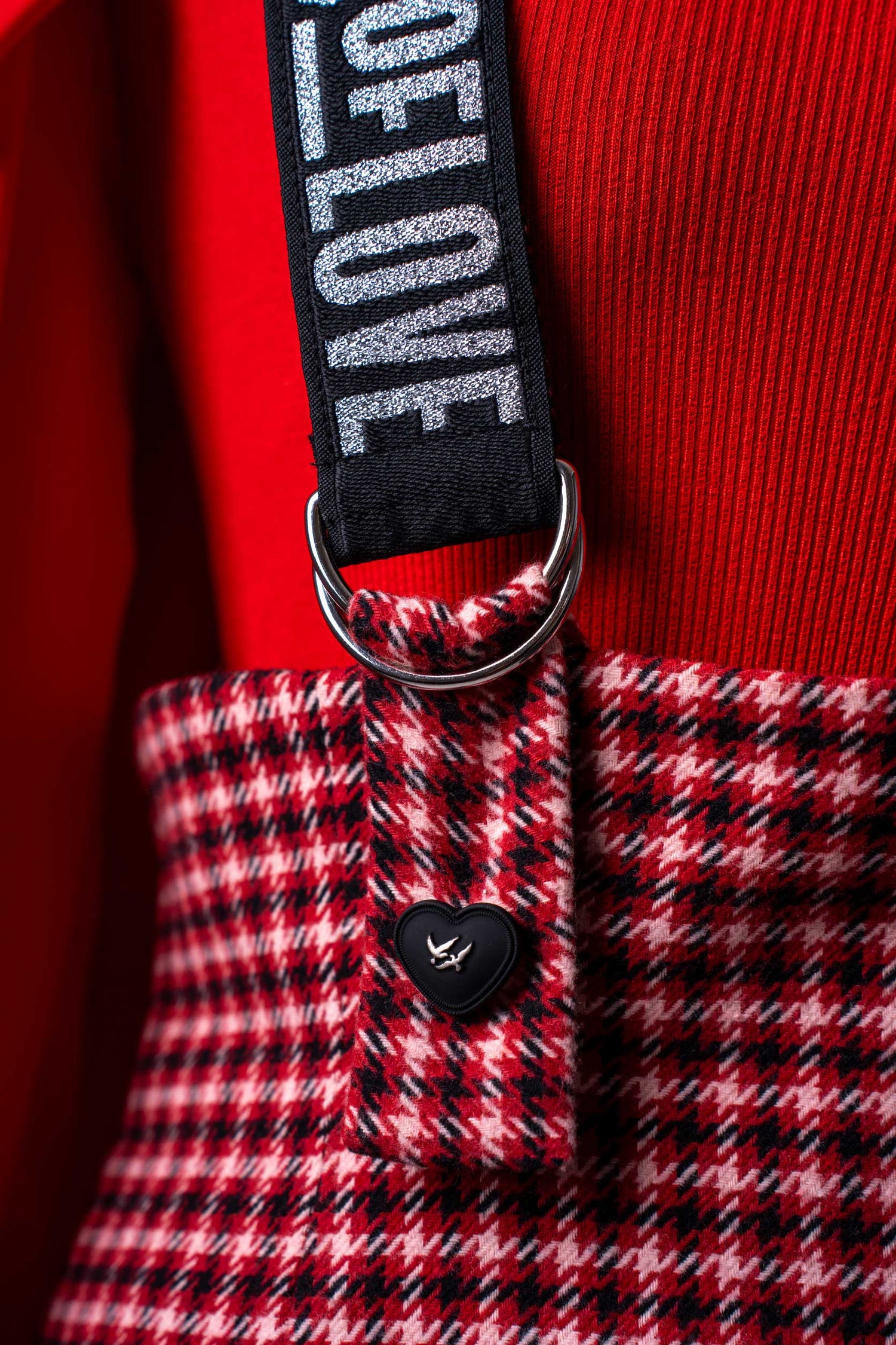 Das Set besteht aus einem auffälligen roten Oberteil mit voluminösen Puffärmeln und einem coolen Latzkleid im Karomuster. Das Oberteil überzeugt mit einem feinen Rippenstrick im Hauptteil, während die Ärmel aus einem leichten, glänzenden Material gefertigt sind. Der Minirock in Schwarz-Rot-Karo hat verstellbare Träger mit Text-Print, die diesem Outfit eine extra Portion urbanen Style verleihen.