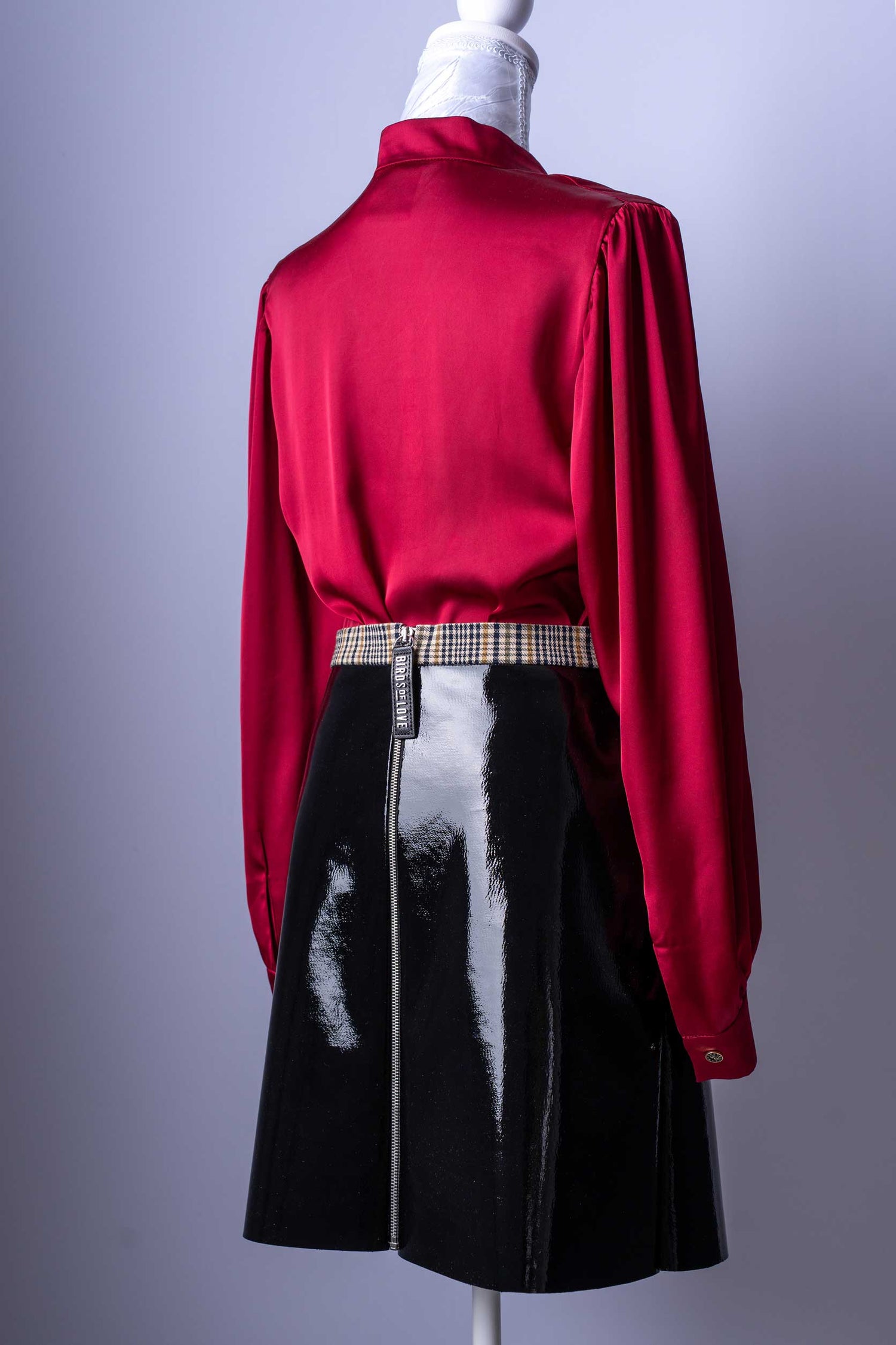 Damen-Outfit Bluse & Rock | Rote Satinbluse | Lackrock mit Karodetails