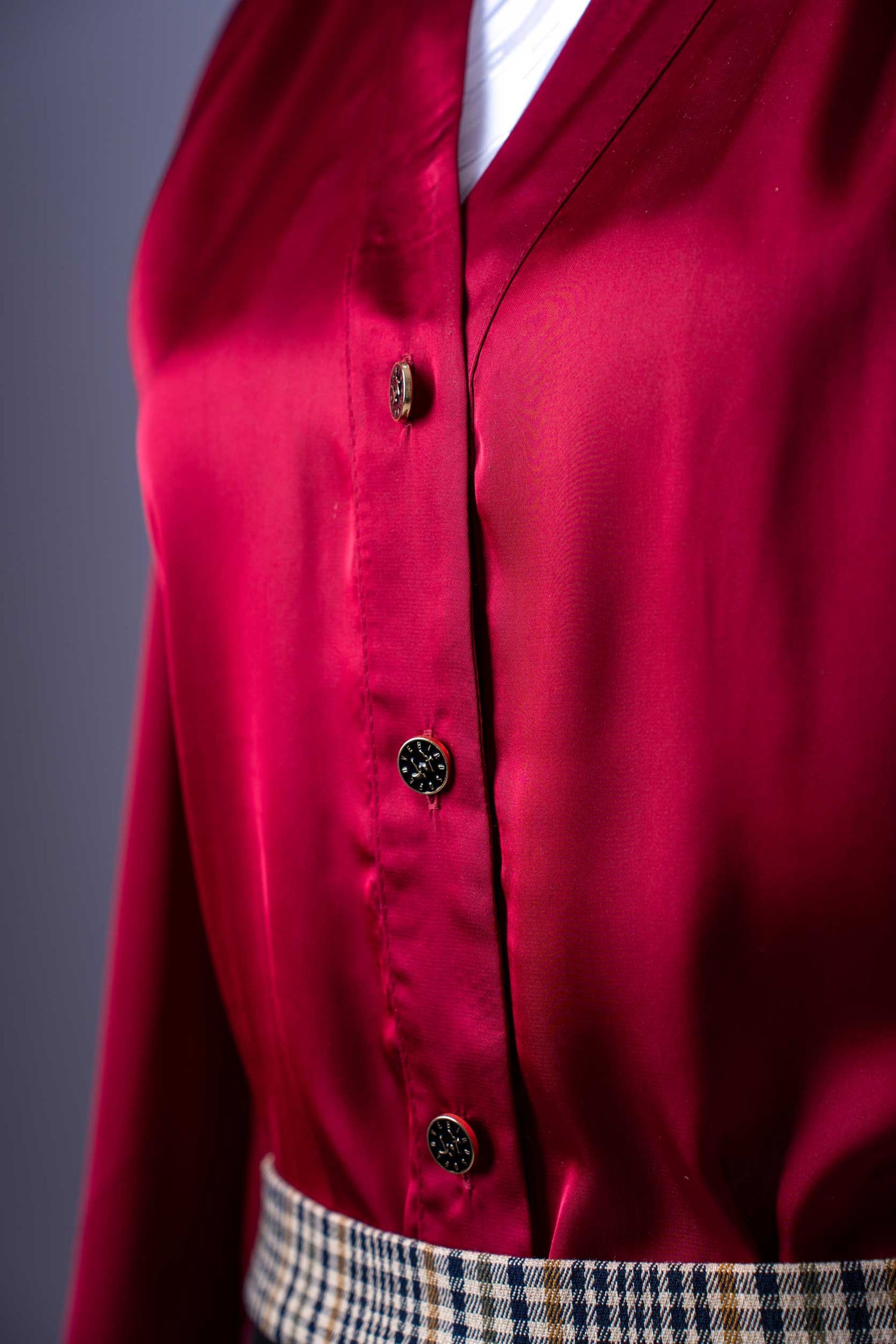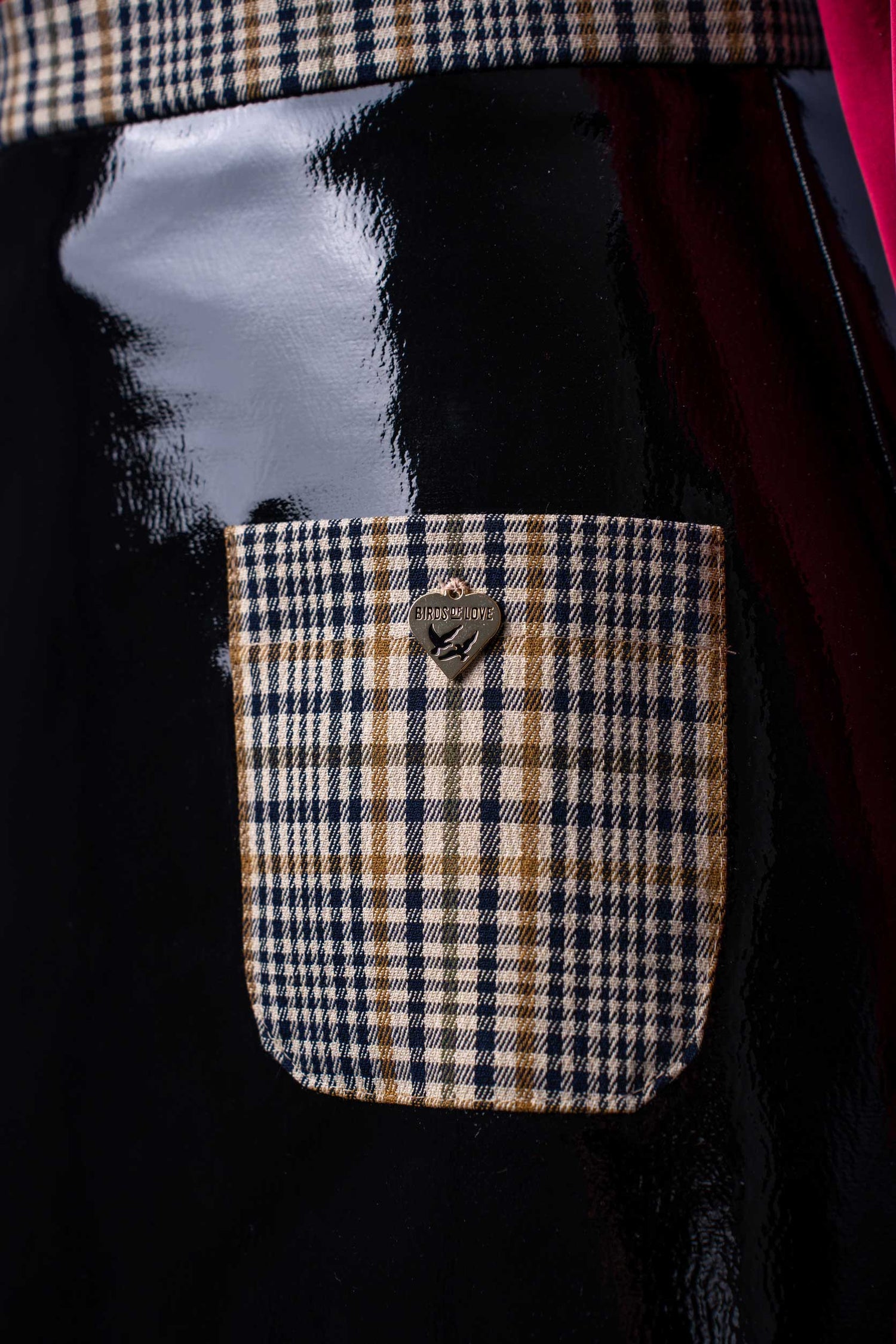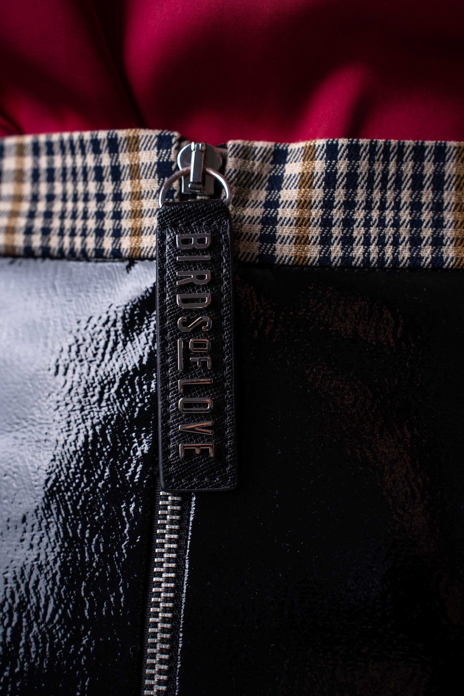 Die elegante Bluse aus rotem Satin fließt sanft um den Körper und besticht durch ihren zarten Glanz und den klassischen Stehkragen. Ihre lange, taillierte Form verleiht dem Ensemble eine raffinierte Note. Dazu passt perfekt der schwarze Minirock aus glänzendem Lackleder-Imitat, der für einen aufregenden Kontrast sorgt. Das Highlight sind die beiden auffälligen Taschen mit stilvollem Karomuster, die dem Look eine einzigartige, modische Note verleihen.