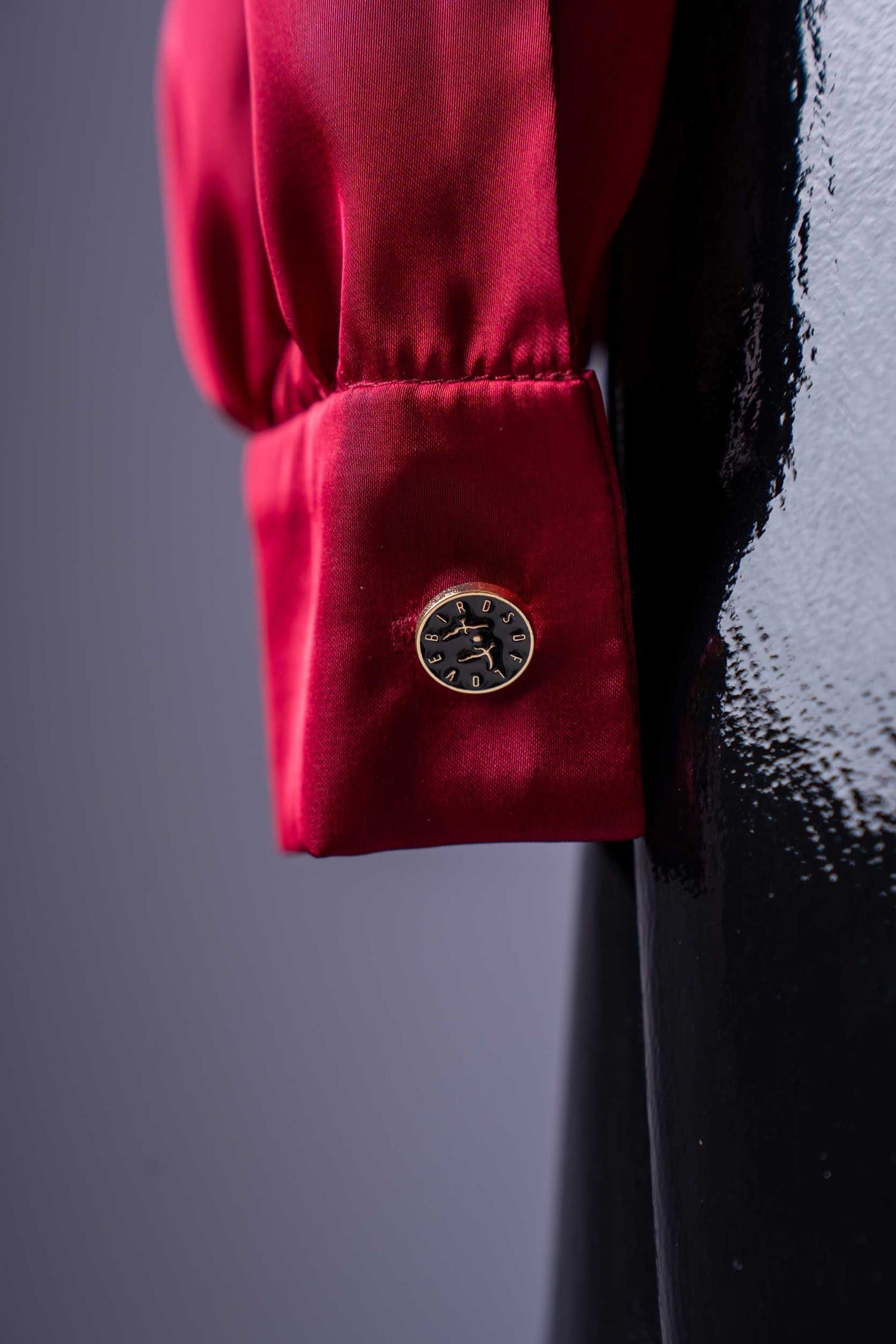 Bluse: Roter Satin-Look, Stehkragen, lange Ärmel
