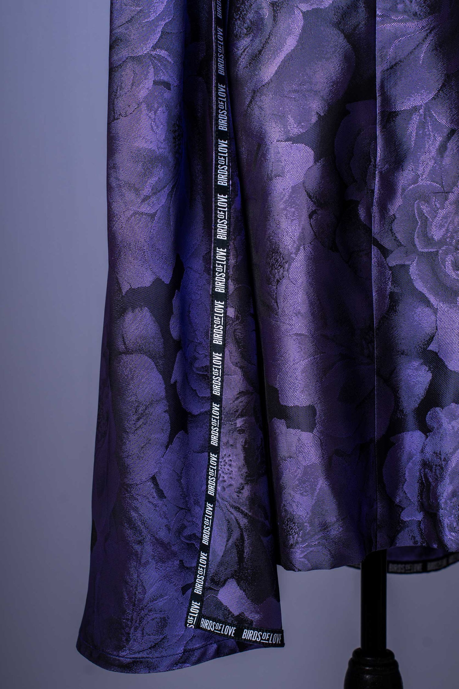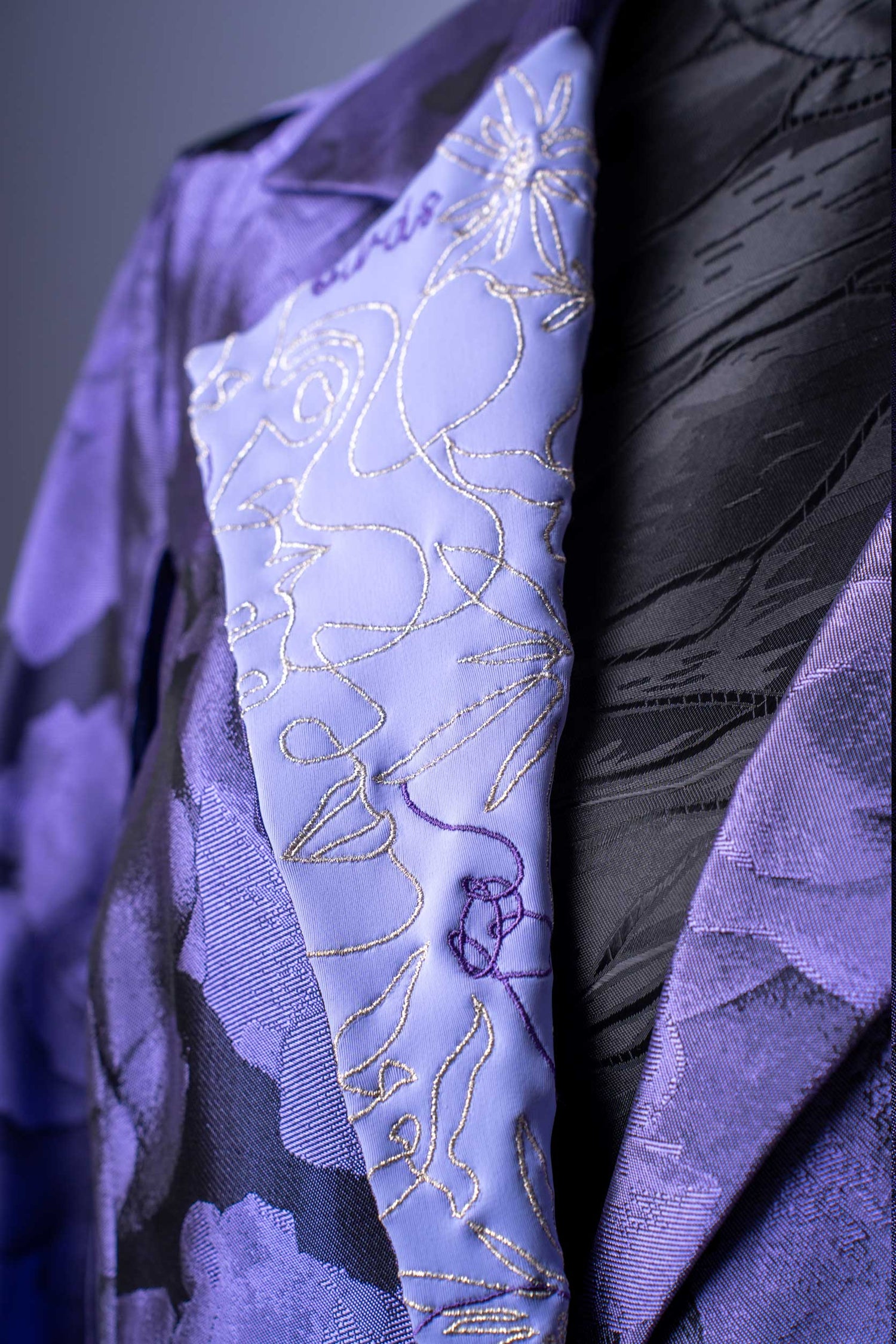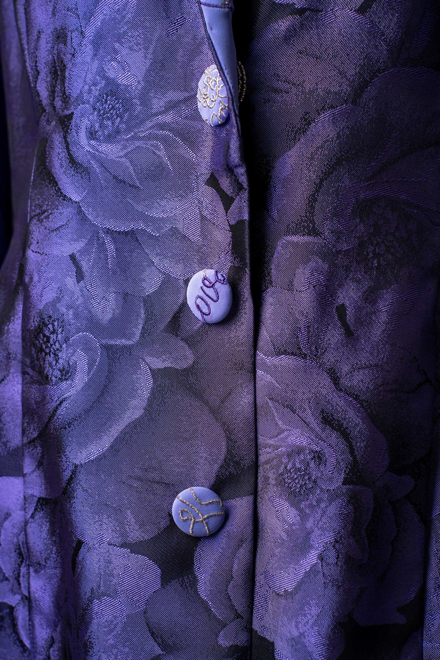 Die Jacke besticht durch ihren tiefen, violetten Farbton und das edle Blumen-Jacquard-Muster. Der weite, fließende Schnitt im Cape-Stil sorgt für eine dramatische und zugleich elegante Silhouette. Ein besonderes Highlight ist das hell gefütterte Revers und das auffällige, textverzierte Saumband am Ärmel, die dem Blazer eine moderne und individuelle Note verleihen.