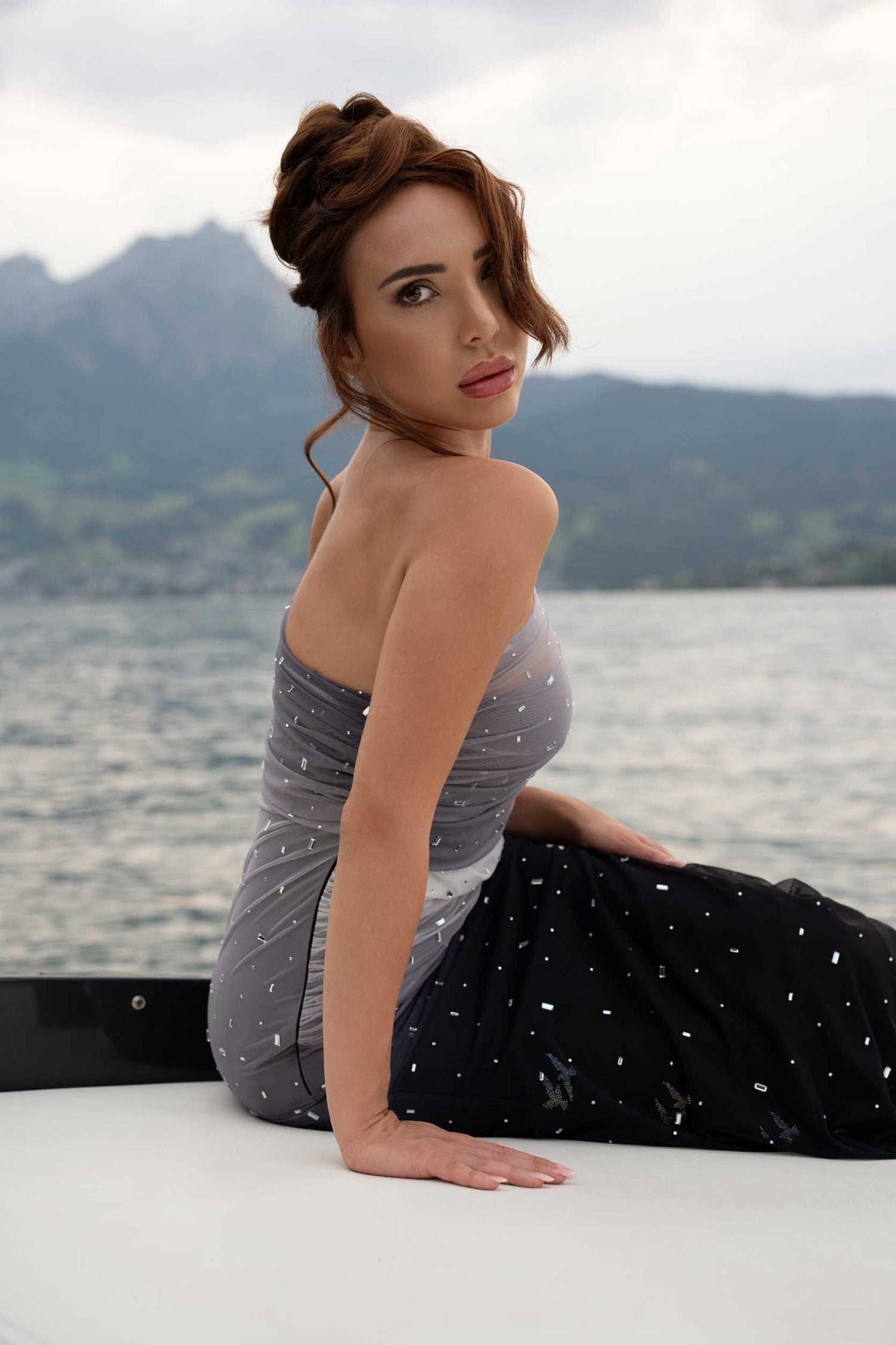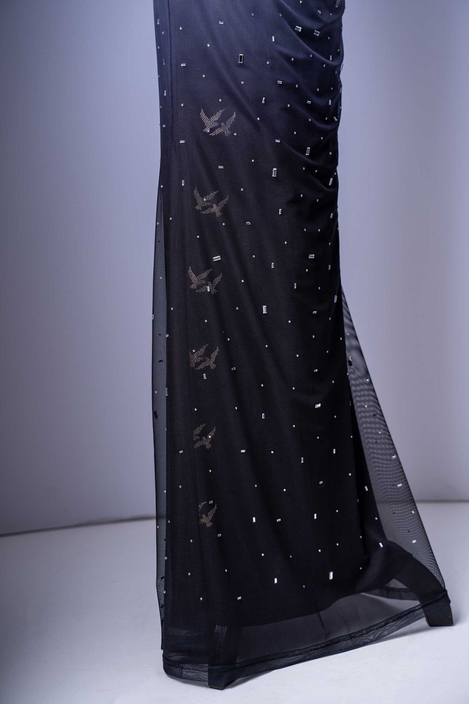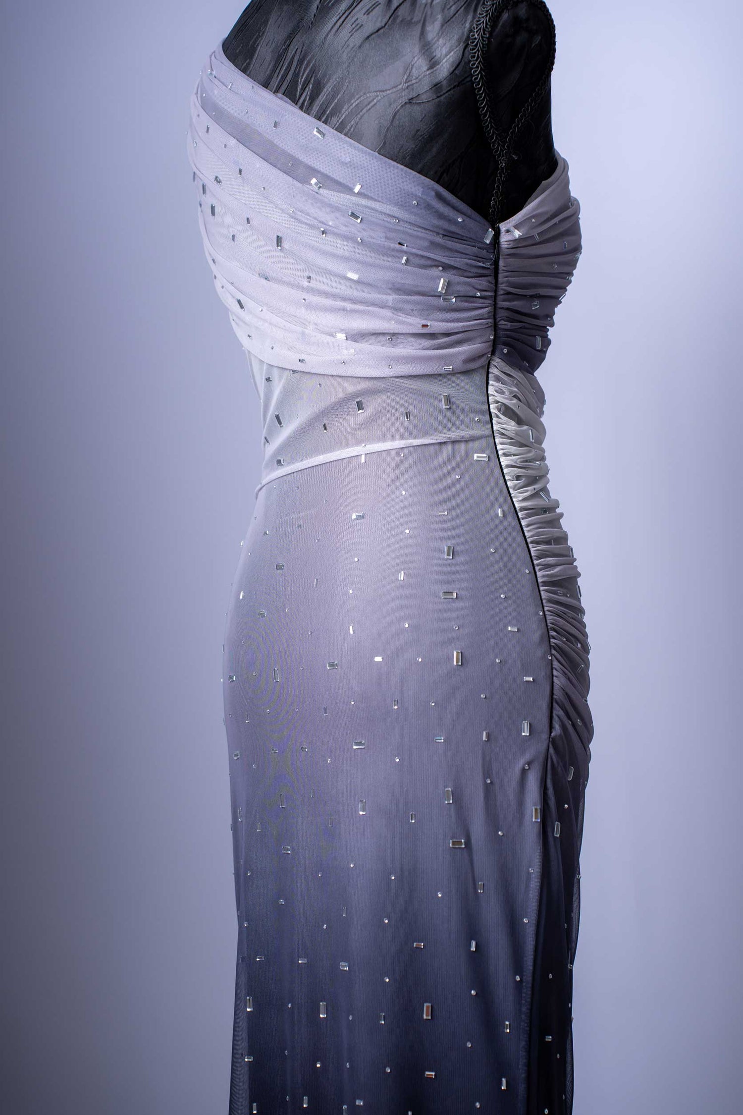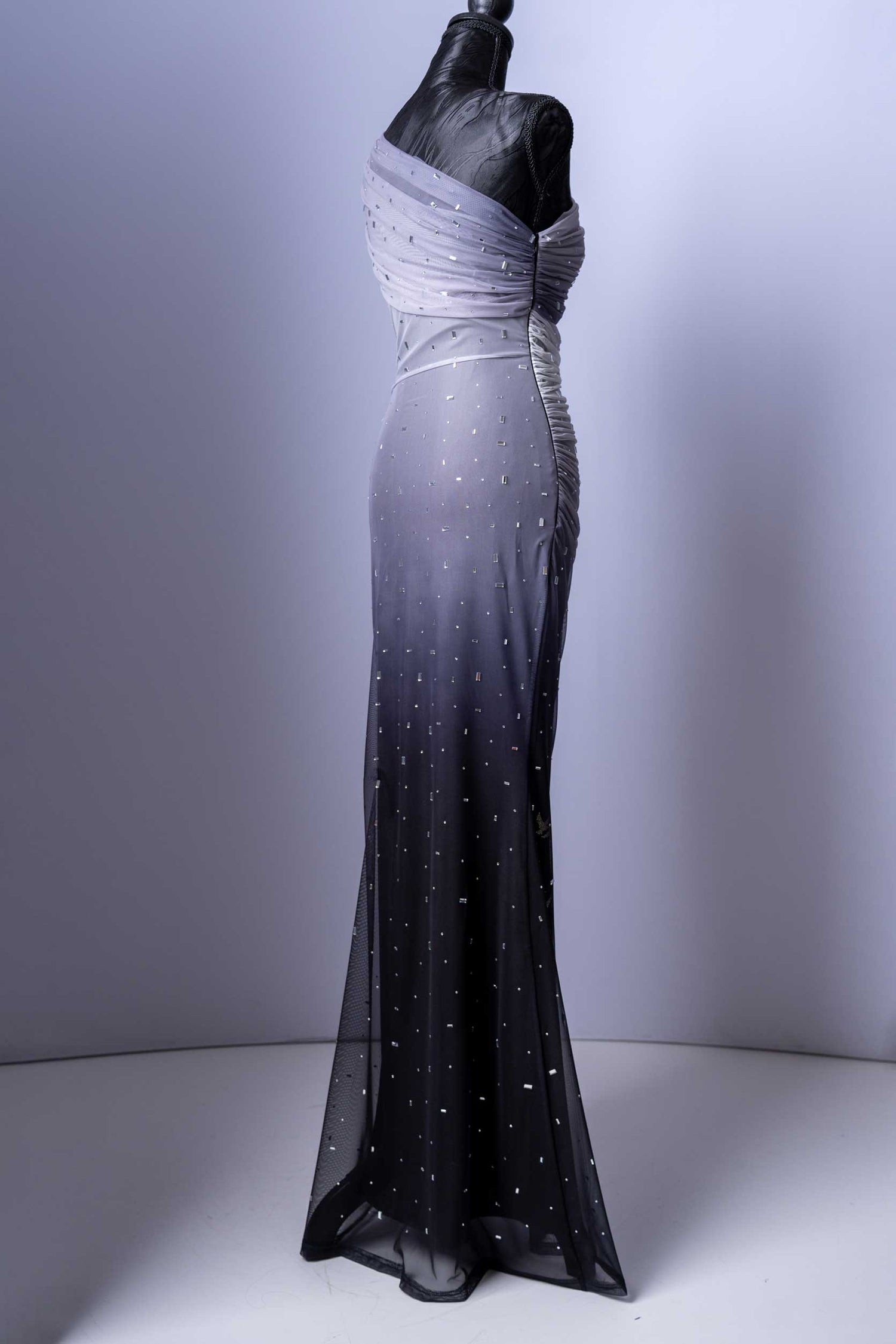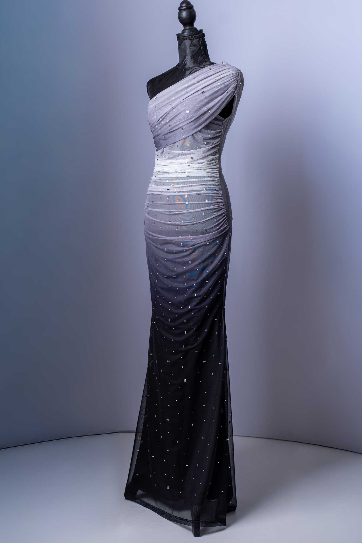 Das Kleid hat ein raffiniertes One-Shoulder-Design mit kunstvoller Drapierung und einem faszinierenden Farbverlauf, der von einem hellen Grauton in einen dunklen, transparenten Rock übergeht. Der obere Teil des Kleides ist mit feiner Perlenstickerei verziert, die sanft schimmert. Der untere, fließende Tüllrock sorgt für eine elegante Silhouette und einen unvergesslichen Auftritt.