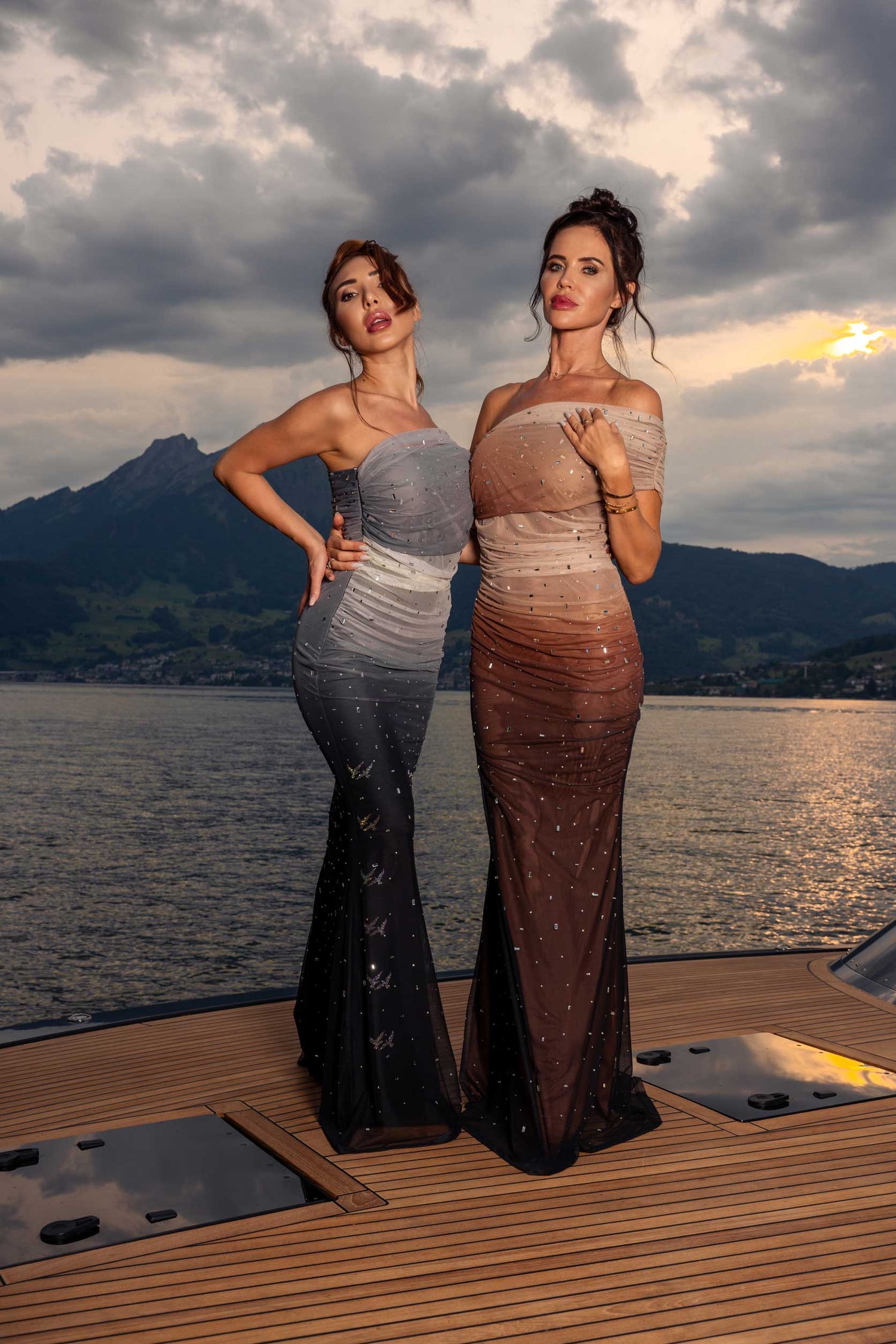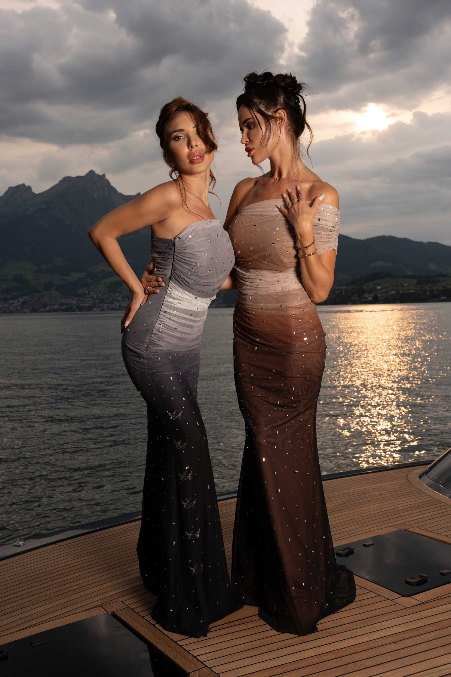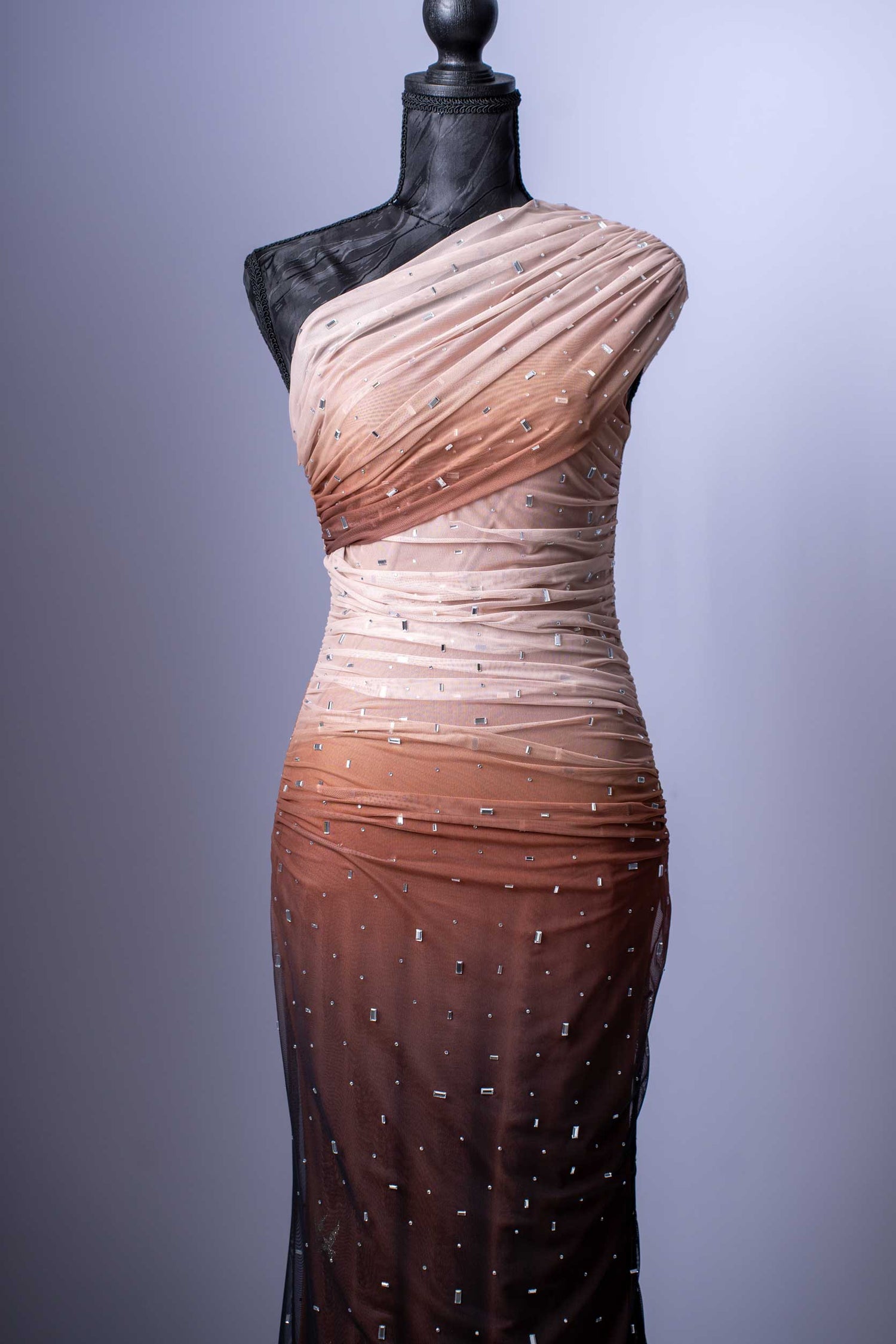 Das Kleid hat ein raffiniertes One-Shoulder-Design mit kunstvoller Drapierung und einem faszinierenden Farbverlauf, der von einem hellen Oberteil in einen dunklen, transparenten Rock übergeht. Der obere Teil des Kleides ist mit feiner Perlenstickerei verziert, die sanft schimmert. Der untere, fließende Tüllrock sorgt für eine elegante Silhouette und einen unvergesslichen Auftritt.