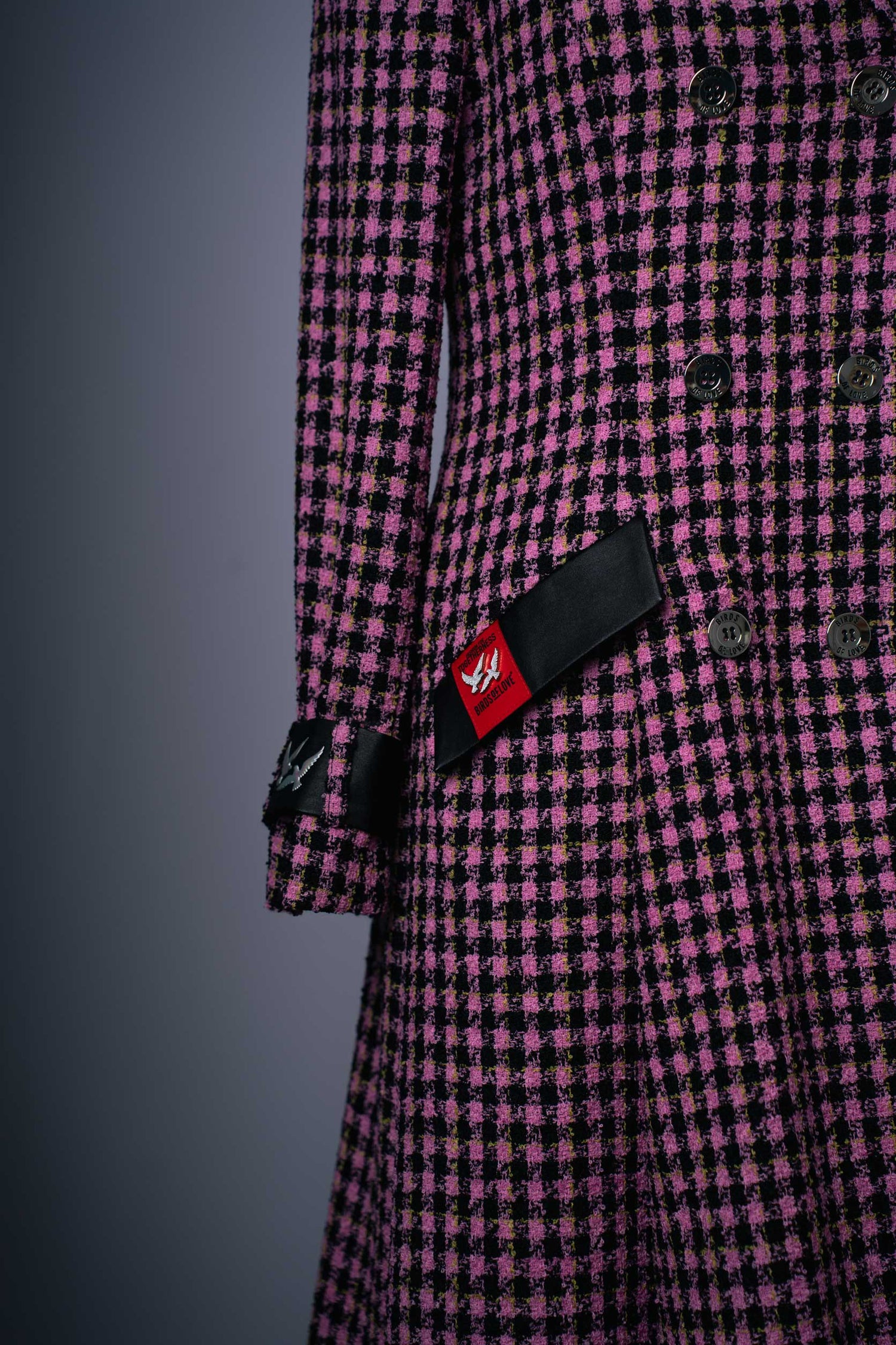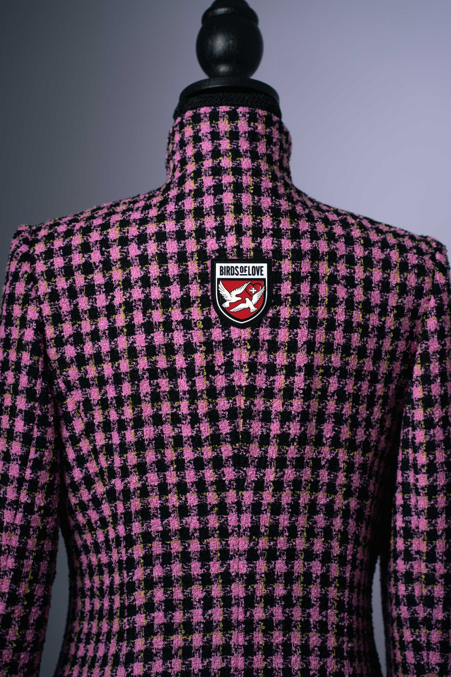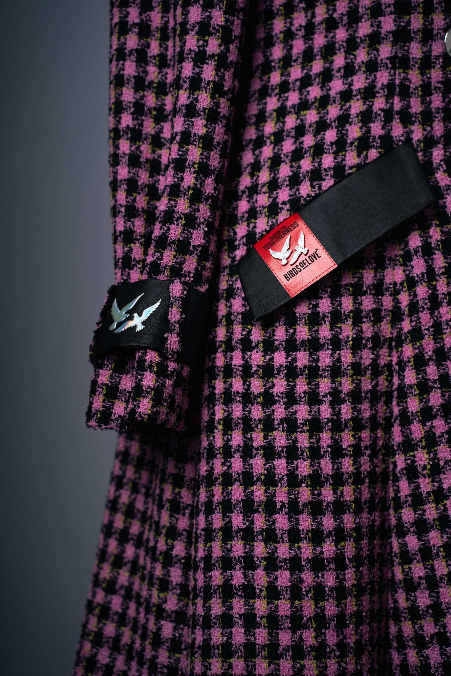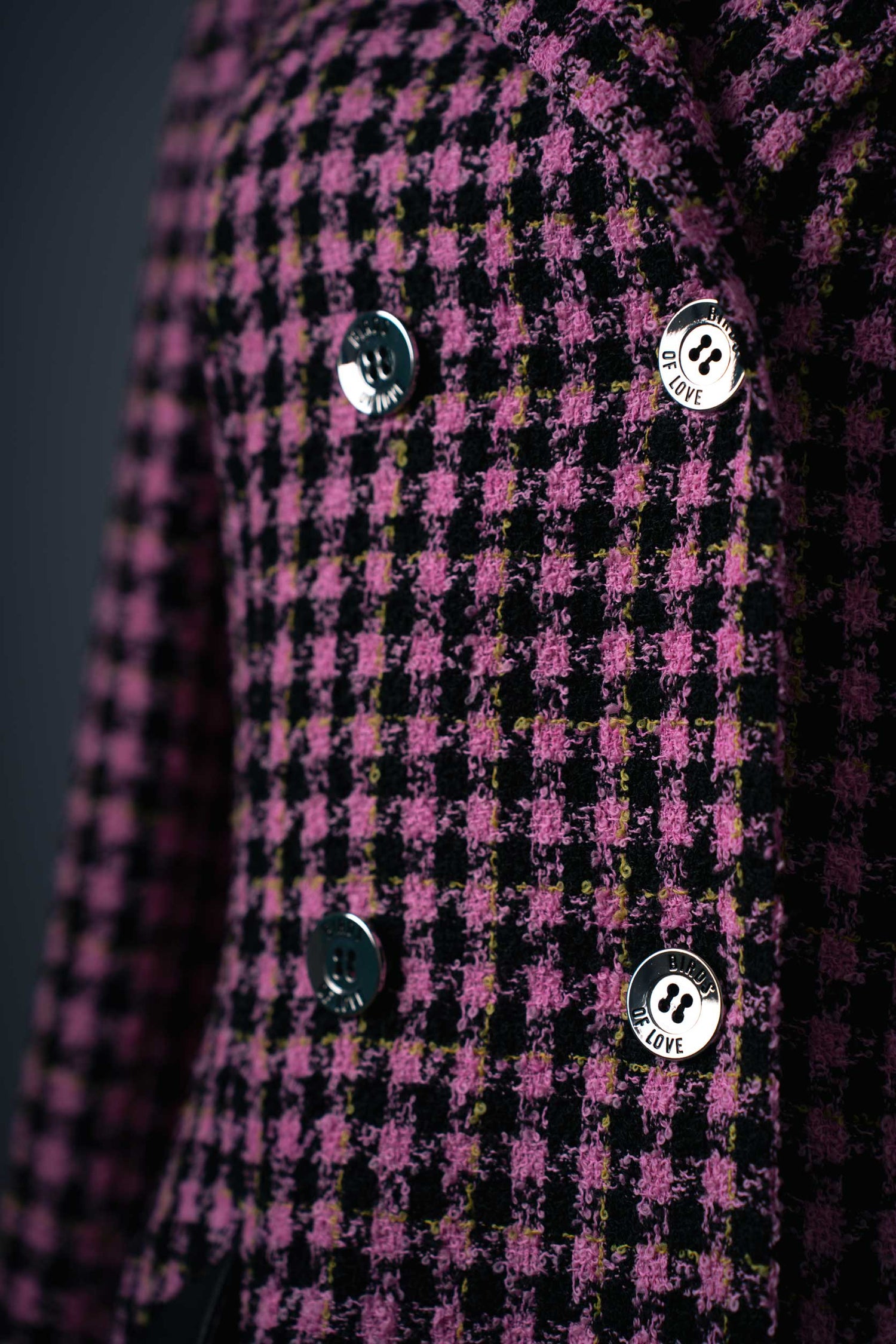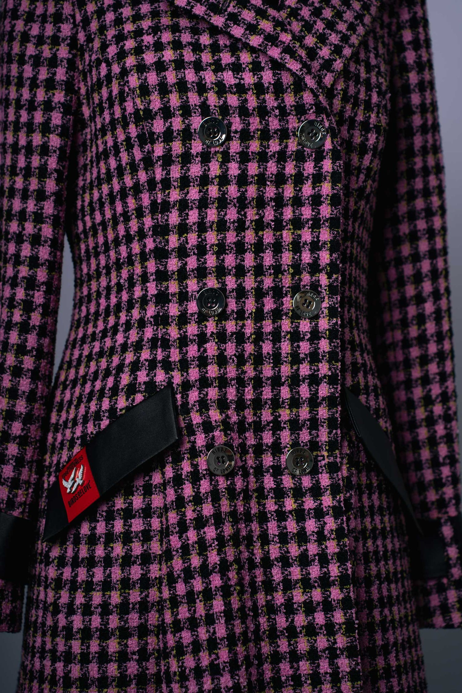 Entdecken Sie diesen exquisiten Damen-Mantel , der klassischen Stil mit modernen Details vereint. Dieser Mantel ist aus einem hochwertigen Tweed-Stoff gefertigt und präsentiert ein auffälliges Hahnentritt-Muster in Schwarz und einem lebhaften Pinkton.